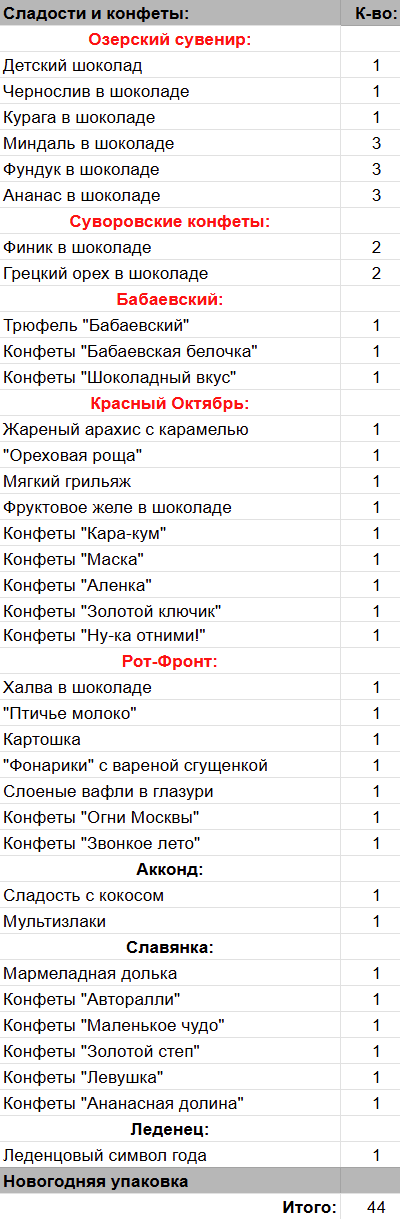 Кол-во сладостей: 44 шт.