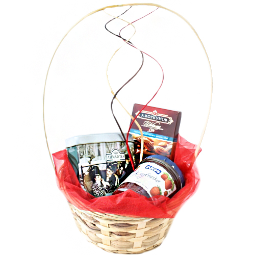 Состав:  корзина, шоколад Коркунов,  чай Ахмад ти Эрл Грей, конфитюр клубничный, декор