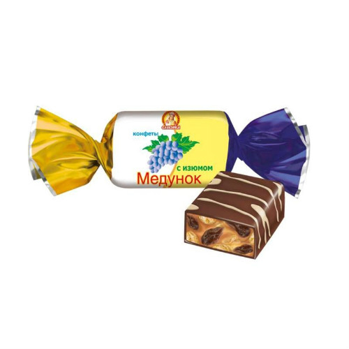Конфеты Медунок с изюмом производства фабрики Славянка можно купить оптом с доставкой по Москве, Подмосковью и ЦФО. Низкая цена обусловлена отсутствием посредников при наличии прямого договора с производителем.  Все актуальные сертификаты в наличии. Минимальный заказ: 1 коробка
