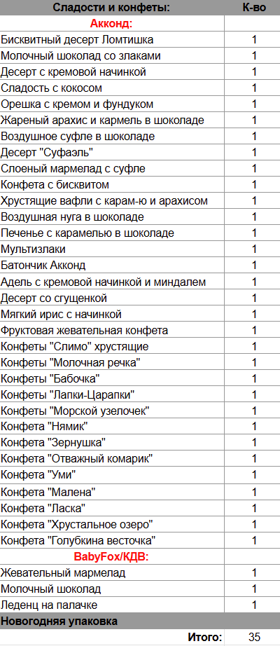 Кол-во сладостей: 35 шт.