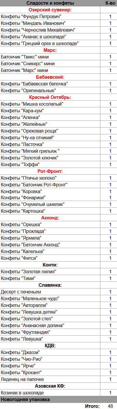 Конфеты "Фундук Петрович" (1 шт), Конфеты "Миндаль Иванович" (1 шт), Конфеты "Чернослив Михайлович" (1 шт), Конфеты "Ананас в шоколаде" (1 шт), Конфеты "Грецкий орех в шоколаде" (1 шт), Конфеты "Бабаевская белочка" (1 шт), Конфеты "Оригинальные" (1 шт), Конфеты "Мишка косолапый" (1 шт), Конфеты "Кара-кум" (1 шт), Конфеты "Аленка" (1 шт), Конфеты "Желейные" (1 шт), Конфеты "Ореховая роща" (1 шт), Конфеты "Ну-ка отними!" (1 шт), Конфеты "Ласточка" (1 шт), Конфеты "Мягкий грильяж " (1 шт), Конфеты "Золотой ключик" (1 шт), Конфеты "Toффи" (1 шт), Конфеты "Птичье молоко" (1 шт), Конфеты "Батончик Рот-Фронт" (1 шт), Конфеты "Коровка" (1 шт), Конфеты "Фонарики" (1 шт), Конфеты "Очумелый шмелик" (1 шт), Конфеты "Картошка" (1 шт), Конфеты "Орешка" (1 шт), Конфеты "Прохлада" (1 шт), Конфеты "Ярмила" (1 шт), Конфеты "Батончик Акконд" (1 шт), Конфеты "Капелька" (1 шт), Конфеты "Фитси" (1 шт), Конфеты "Золотая лилия" (1 шт), Конфеты "Тими" (1 шт), Десерт с печеньем (1 шт), Конфеты "Маленькое чудо" (1 шт), Конфеты "Авторалли" (1 шт), Конфеты "Левушка детям" (1 шт), Конфеты "Золотой степ" (1 шт), Конфеты "Ананасная долина" (1 шт), Конфеты "Фрутландия" (1 шт), Конфеты "Левушка" (1 шт), Конфеты "Джаззи" (1 шт), Конфеты "Чио-Рио" (1 шт), Конфеты "Ярче" (1 шт), Конфеты "Крокант" (1 шт)
