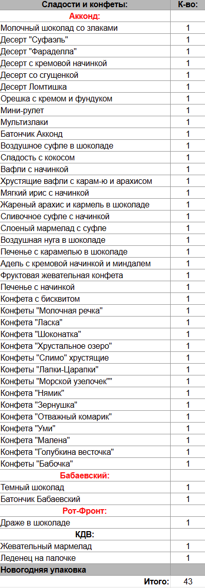 Кол-во сладостей: 43 шт.
