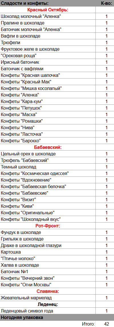 Кол-во сладостей: 42 шт.